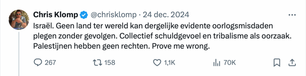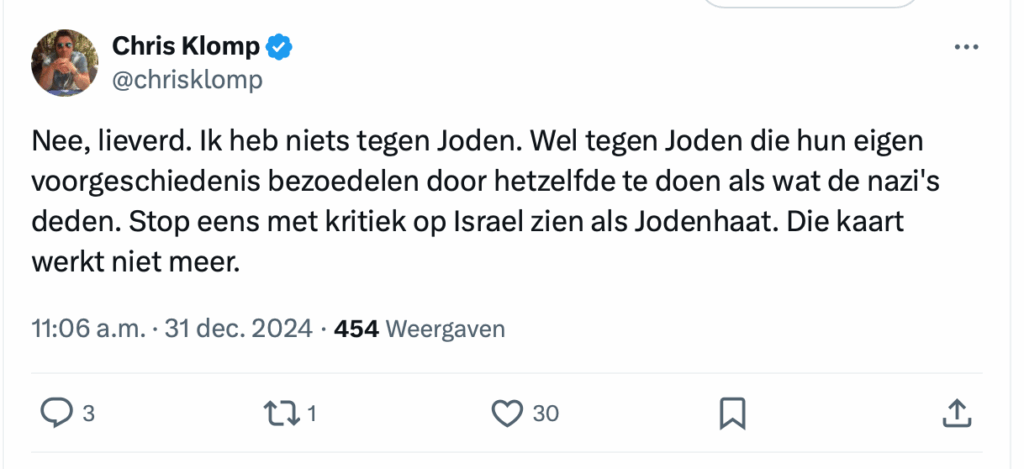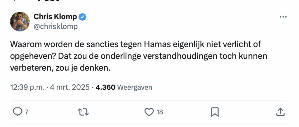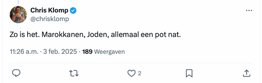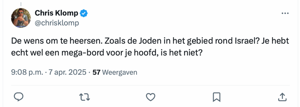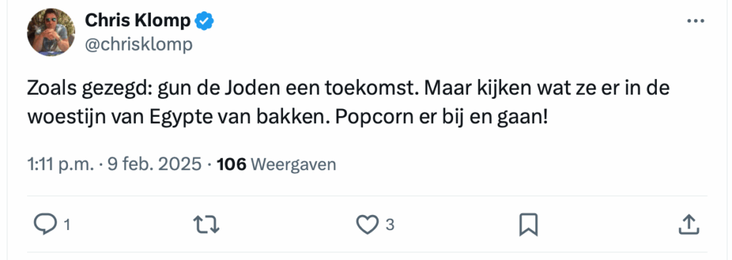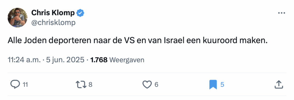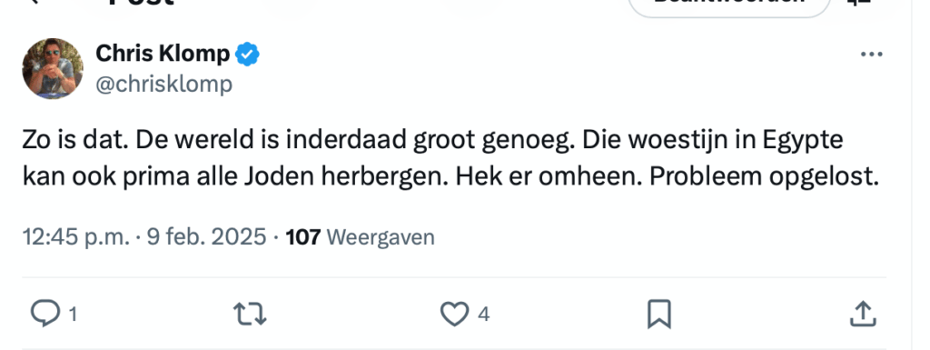 Waarom hij dat schreef? Omdat iemand op X vroeg“Als ik nu eens over die rode lijn heen kijk, zie ik dan een (suggestie voor) een definitieve oplossing?” Klomps antwoord: deportatie. Geen grap, geen uitleg. Gewoon een keiharde uitspraak.