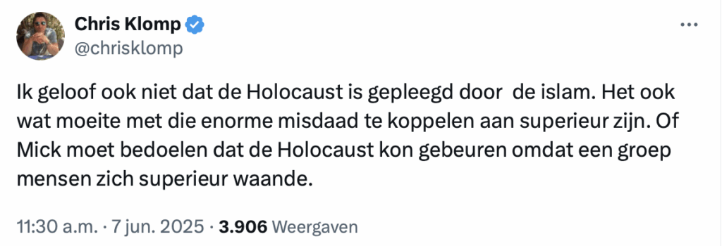 “Ik geloof ook niet dat de Holocaust is gepleegd door de islam. Heb ook wat moeite met die enorme misdaad te koppelen aan superieur zijn.”