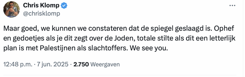“Maar goed, we kunnen we constateren dat de spiegel geslaagd is. Ophef en gedoetjes als je dit zegt over de Joden, totale stilte als dit een letterlijk plan is met Palestijnen als slachtoffers. We see you.”
